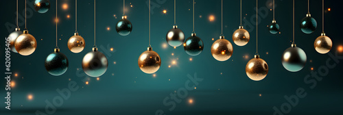 Obraz premium Luxury Christmas banner with hanging gold and green balls on a sparkeling background. Illustration AI Generative.