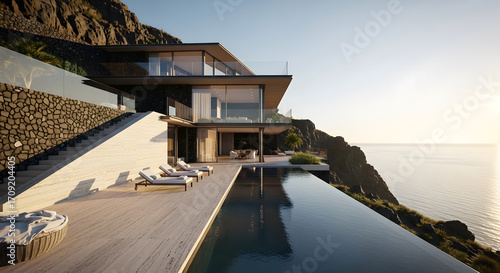 © Deliana Studio, Fototapeta premium Luxury Cliffside Villa with Infinity Pool Overlooking the Ocean at Sunset