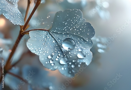 Fototapeta premium Luxury close-up of a frosty leaf with water droplets, perfect for winter-themed campaigns and nature-inspired designs