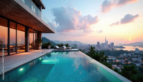 Obraz premium Luxury condo building rooftop pool and city view, perspective, relaxation