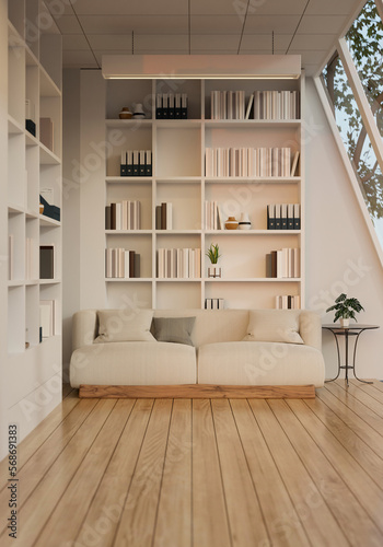 Fototapeta premium Luxury contemporary home reading room or living room interior with bookshelves, white couch