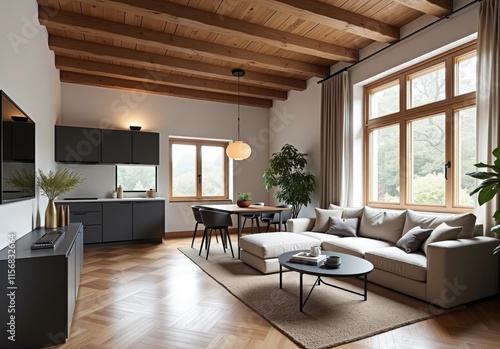 © Marko, Fototapeta premium luxury cozy apartment interior living room with skandinavian elements and kitchen with parquet floor and ceiling with beams of coniferous wood and big windows