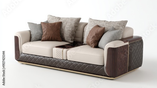 © nicole, Fototapeta premium Luxury cream and brown leather modular sofa with wood and gold accents