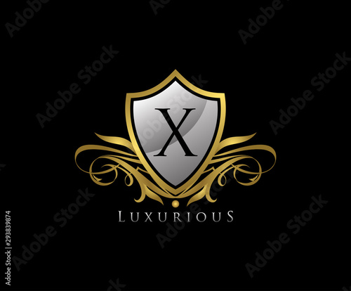 Obraz premium Luxury Gold Shield X Letter Logo Icon. Elegant X Letter Icon.