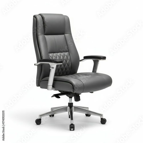 © Jimoon, Obraz premium Luxury High-Back Grey Leather Executive Office Chair with Quilted Stitching and Metal Base Isolated