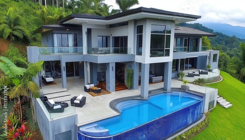 © Richafuji, Fototapeta premium Luxury Hilltop Estate with Infinity Pool and Stunning Mountain Views: A Tropical Paradise Retreat