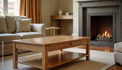Fototapeta premium Luxury hotel room interior featuring comfortable light beige sofa, wooden coffee table. Cozy atmosphere with fireplace adding warmth. Design elements suggest sophisticated, elegant style. Natural