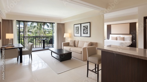 Fototapeta premium Luxury hotel suite with open-plan living area and tropical view. Elegant...