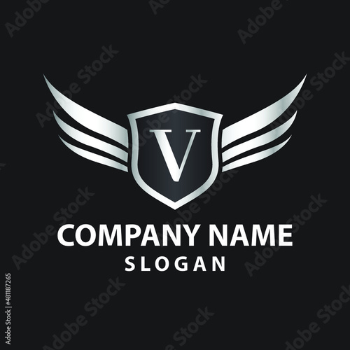 Obraz premium Luxury Letter V Gold Wing with Shield Logo template, Golden Wing Shield Luxury Initial Letter V logo