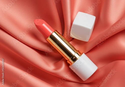 © Akash, Obraz premium Luxury lipstick in coral pink shade with gold and white packaging on soft silky background in studio lighting