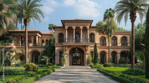 © Eva, Naklejka premium Luxury mansion exterior with garden, palm trees, and clear sky