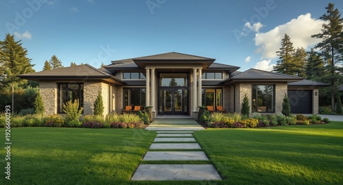 Obraz premium Luxury modern home exterior with upscale design and manicured landscaping