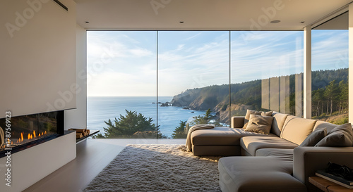 © hsavect1, Naklejka premium Luxury modern home interior with vast ocean view through expansive glass windows, featuring a cozy fireplace and stylish sectional sofa.