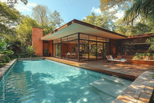 © smalltinykid, Fototapeta premium Luxury modern villa pool garden in Scandinavian design bright daylight