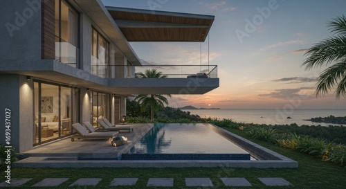 © Bayu, Fototapeta premium Luxury Modern Villa with Infinity Pool Overlooking Ocean Sunset