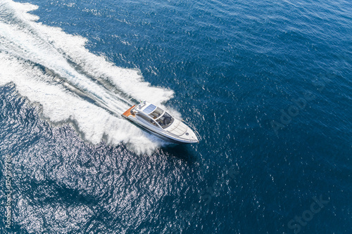 © Andrea, Fototapeta premium luxury motor boat, rio yachts italian shipyard, aerial view