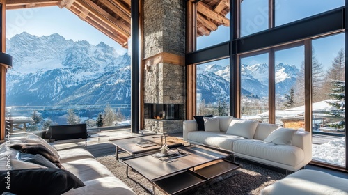 Fototapeta premium Luxury mountain chalet with large panoramic windows, wood and stone finish, snow-capped background
