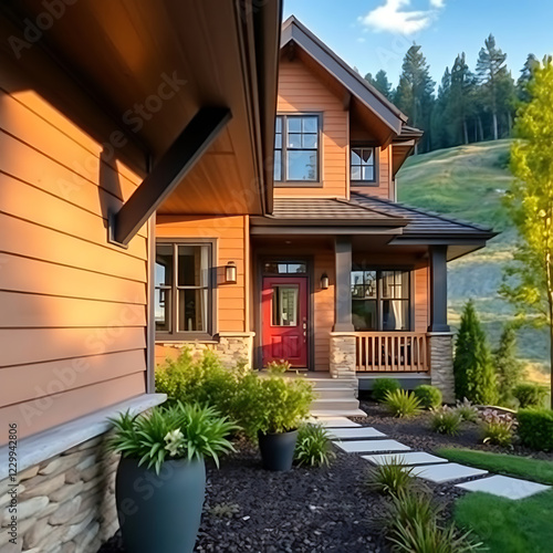 Obraz premium Luxury Mountain Home: Modern Architecture, Stunning Views. A dream home nestled in nature, showcasing contemporary design and exquisite landscaping.
