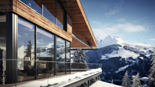 © evening_tao, Obraz premium Luxury Mountain Home with a Stunning Snowy View