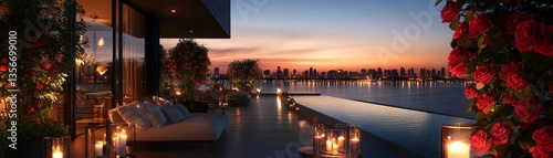 Fototapeta premium Luxury outdoor living space with sunset, flowers, and ambient lighting.