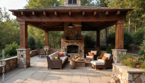 Naklejka premium Luxury Outdoor Patio Design with Stone Fireplace and Wooden Pergola