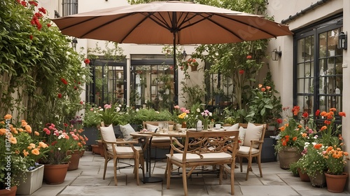 © indofootage, Fototapeta premium Luxury outdoor terrace with a comfortable seating area, a large umbrella, and a collection of plants and flowers. Side view
