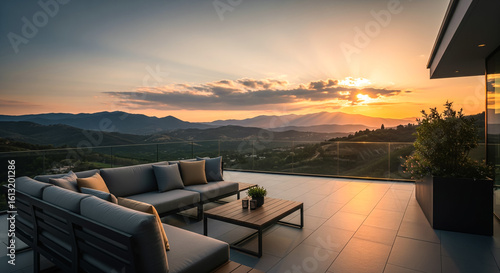 © PixelSynth, Obraz premium Luxury patio seating with mountain sunset view