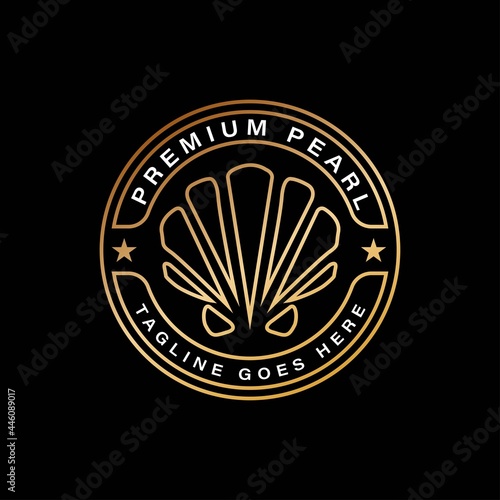 Fototapeta premium Luxury Pearl Logo Design. With premium gold circle and stars on black background