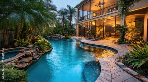 Fototapeta premium Luxury Poolside Oasis: Evening Tranquility at a Tropical Estate