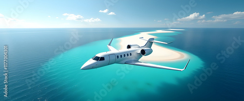 Fototapeta premium Luxury private jet soaring over a pristine, tropical island paradise;...