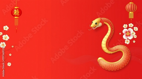 © Rsquare stock, Obraz premium Luxury Red and Gold Chinese New Year 2025 Background – Creative Snake Zodiac Design with Lanterns and Floral Motifs, Chinese New Year copy space background, 2025 Lunar New Year Celebration