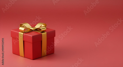 Obraz premium Luxury Red Gift Box with Gold Ribbon and Bow on Red Background with Copy Space