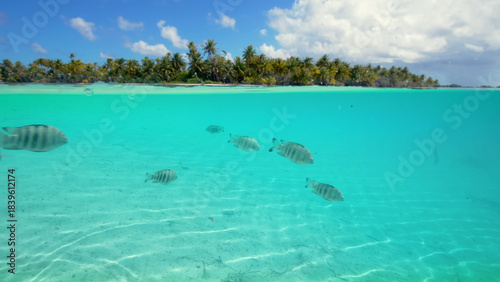 Naklejka premium Luxury resort photo of French Polynesia tropical paradise Fakarava island with exotic fish under wave of clear water on seabed, palm tree, azure Pacific ocean, sky with clouds.