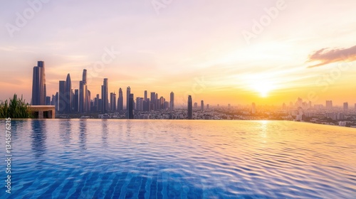 Fototapeta premium Luxury Rooftop Pool with Urban Skyline at Sunset