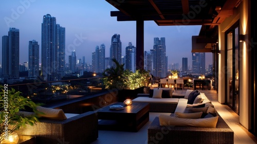 Obraz premium Luxury Rooftop Terrace with City Skyline at Dusk