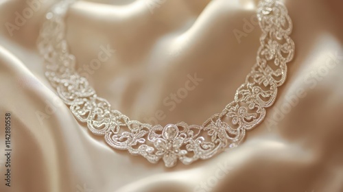 Fototapeta premium luxury silver necklace glistens under soft lighting, detailed with intricate patterns, resting against a silk backdrop, evoking elegance and sophistication