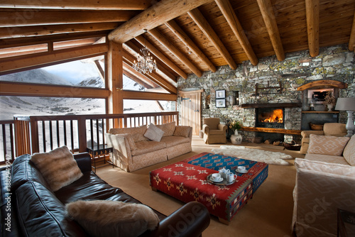 © Aitcheeboy, Fototapeta premium Luxury ski chalet interior with wide views over snow covered mountain. Comfy sofas and blazing log fire with table set for afternoon tea.