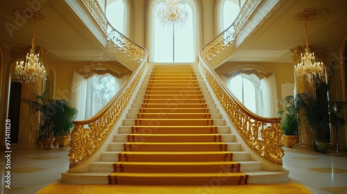 Obraz premium Luxury staircase with gleaming golden railings and a plush yellow carpet,...