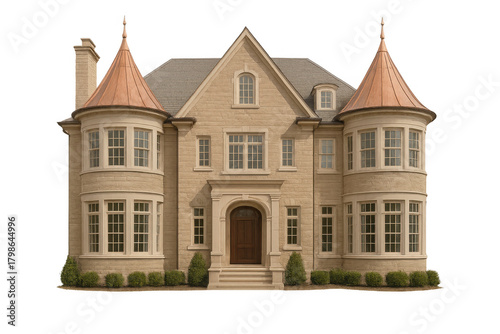© PNG Kingdom , Naklejka premium Luxury stone mansion with copper turrets, a large residential home representing real estate and prosperity on transparent background