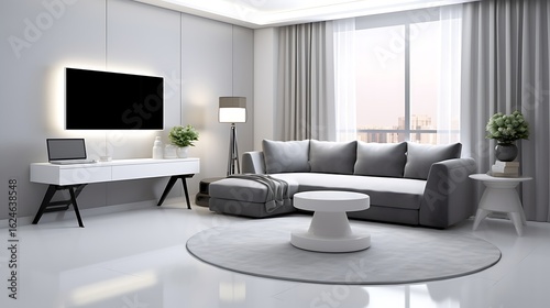 © rayyan, Obraz premium Luxury studio apartment interior design with armless soft grey couch, pale grey marble floor, workspace corner with clean white desk, round stool and ultrathin laptop, 3D Illustrations. 3D Rendering,