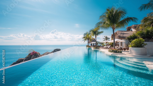 Naklejka premium Luxury Tropical Infinity Pool Overlooking the Ocean with Palm Trees and Resort Lounge Area on a Sunny Day