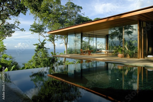 © Richafuji, Obraz premium Luxury Tropical Villa with Infinity Pool and Ocean View: Stunning Modern Architecture in Lush Rainforest Setting