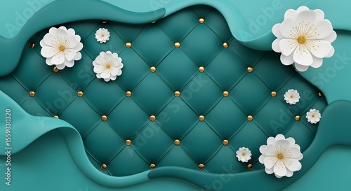 © Nishita, Fototapeta premium Luxury turquoise quilted background with gold studs and white paper flowers stock photo image