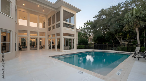 © julio, Fototapeta premium Luxury Villa Exterior Featuring Swimming Pool and Expansive Windows