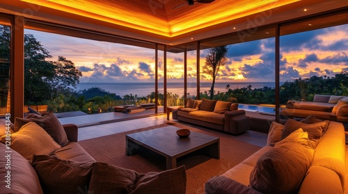 © Aranya, Fototapeta premium Luxury villa living room with floor-to-ceiling windows,