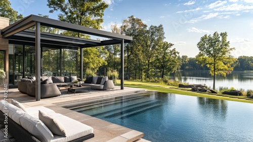 © Intach, Fototapeta premium Luxury villa with a poolside cabana, modern outdoor furniture, and an unobstructed view of a serene lake