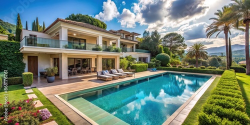 © Sujid, Fototapeta premium Luxury villa with pool surrounded by lush greenery and stunning views, luxury, villa, pool, swimming, private, estate
