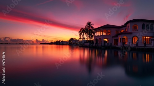 Fototapeta premium Luxury waterfront home at sunset with vibrant sky reflection.