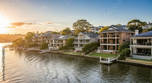 © zakaria, Fototapeta premium Luxury waterfront homes with stunning views at sunset