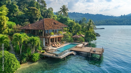 © Zidan, Fototapeta premium Luxury Waterfront Villa in Tropical Paradise: Secluded Island Getaway